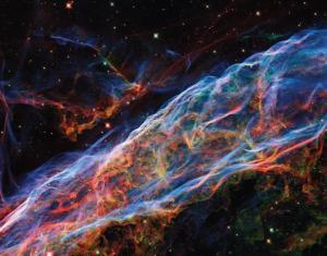 n of the nearby Cygnus Loop, a supernova remnant formed roughly 10,000 years ago by the death of a massive star. The Veil Nebula’s progenitor star—which was 20 times the mass of our Sun—lived fast and died young, ending its life in a cataclysmic release of energy. Despite this stellar explosion, the shock waves and debris from the supernova sculpted the Veil Nebula’s delicate tracery of ionized gas, creating a scene of surprising astronomical beauty.”